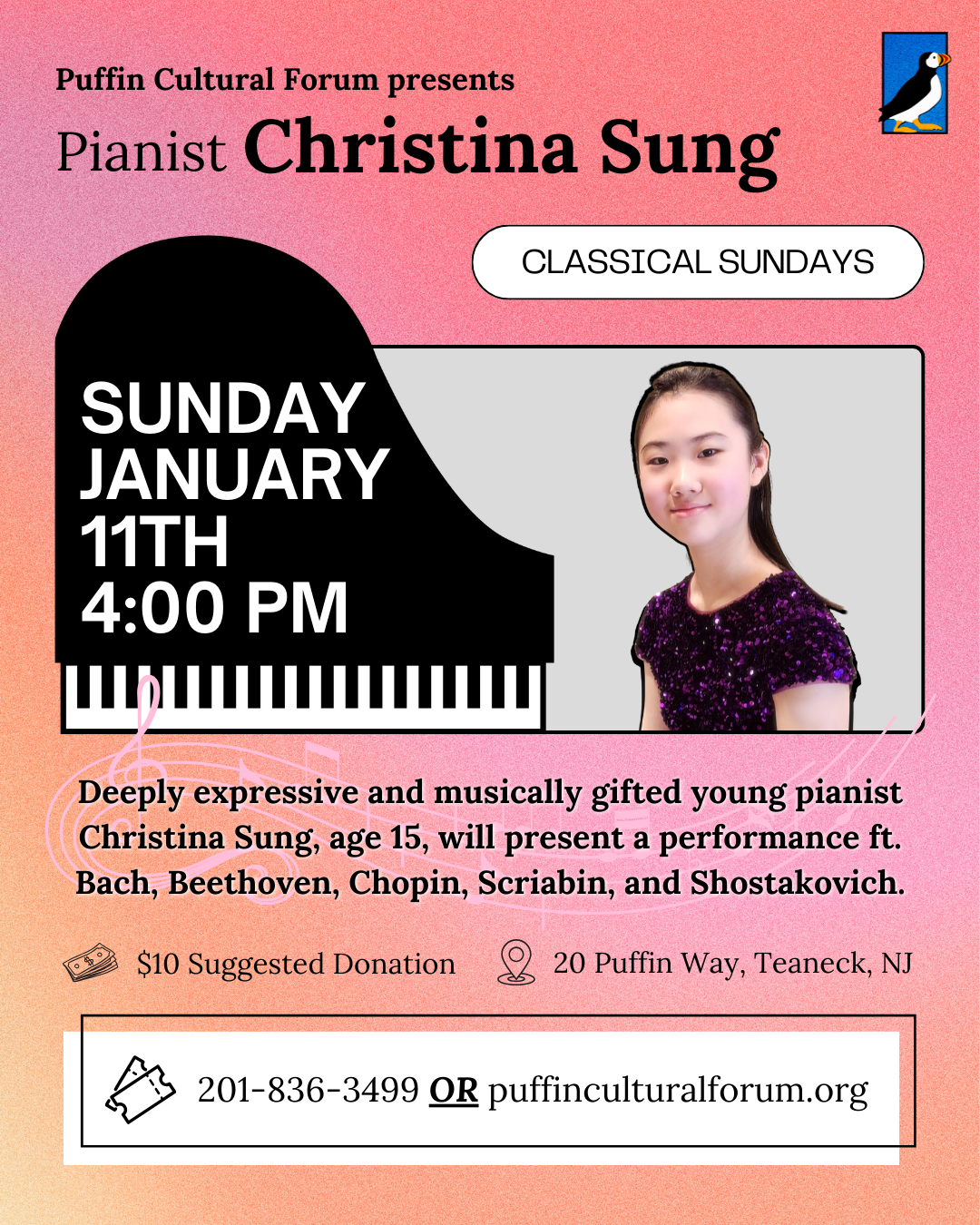 Deeply expressive and musically gifted young pianist Christina D. Sung, age 15, will present a performance featuring works by a diverse range of composers, including Bach, Beethoven, Chopin, Ravel, Scriabin, and Shostakovich. This complete cycle of the program explores a variety of musical styles, from the Baroque and Classical periods, through Chopin’s romantic passion, to the dramatic virtuosity in the music of Scriabin and Shostakovich. This Forum recital offers a special preview of the repertoire Christina will perform as an official competitor at the upcoming 2026 Gina Bachauer International Piano Competition, giving audiences an intimate opportunity to experience her interpretations before she steps onto the international stage.