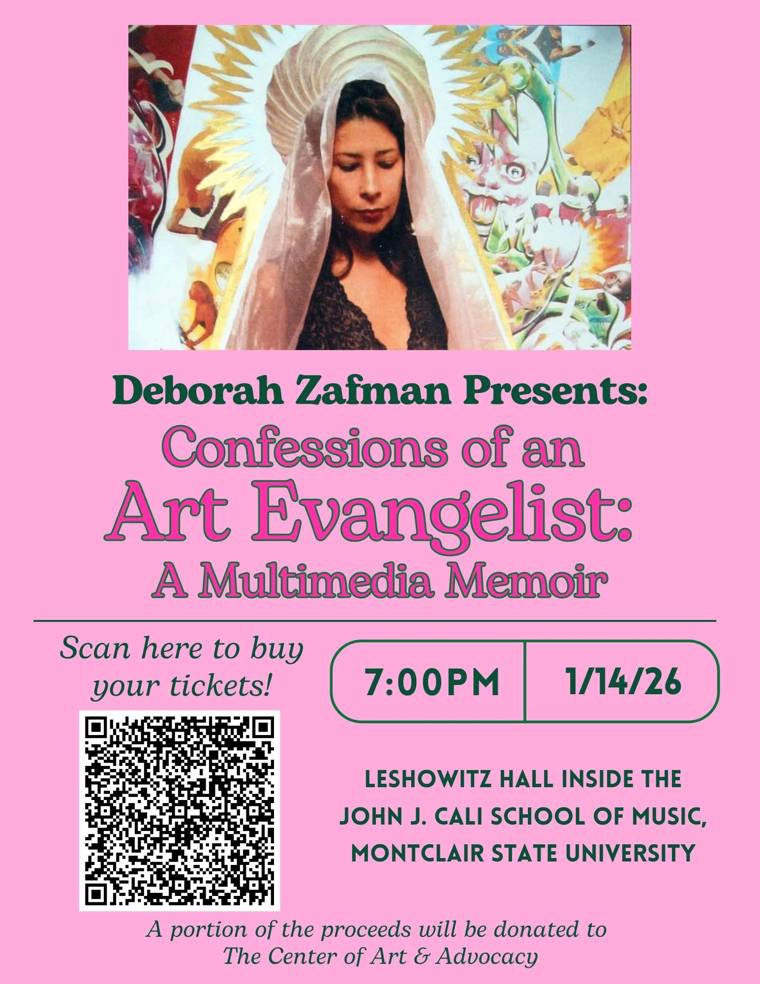 On Wednesday, January 14th, 2025 at 7:30PM, the public premiere of "Confessions of an Art Evangelist: A Multimedia Memoir" will be staged at Montclair State University’s John J. Cali School of Music, Leshowitz Hall. Created and performed by Deborah Zafman, Ph.D. — art historian, writer, appraiser, former gallerist, and thought leader — this one-woman show offers an unforgettable evening of storytelling and art. Seating is limited to 180 tickets only. Doors open at 7:00 PM.