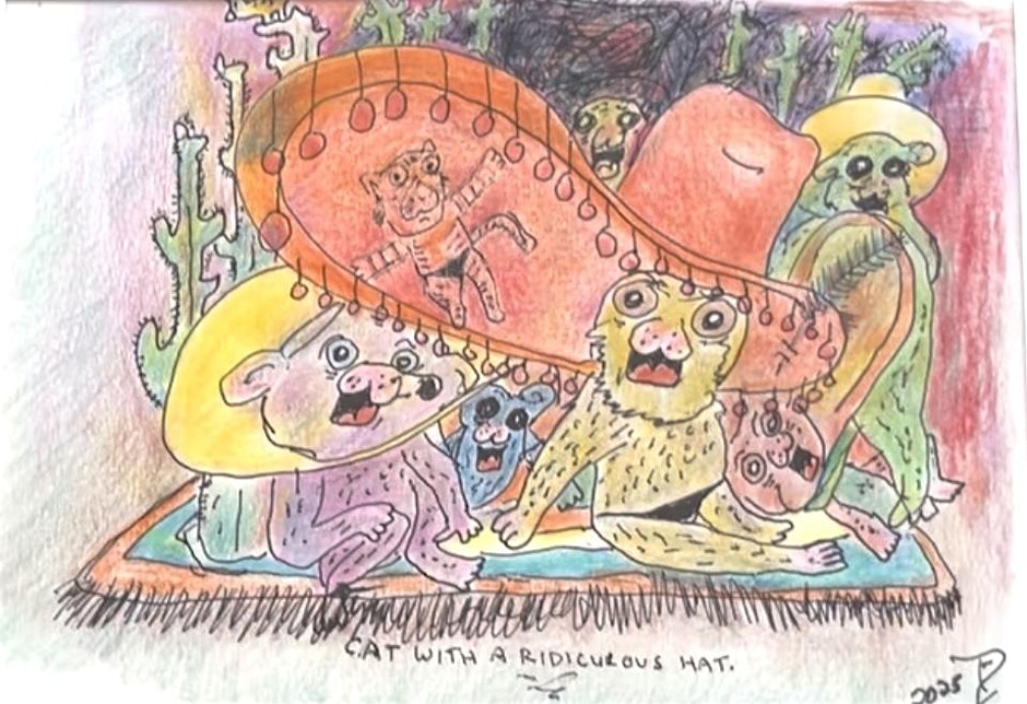 Presently, Ted is working with colored pencils on paper, expressing the consistent underlying themes of humor and absurdity.